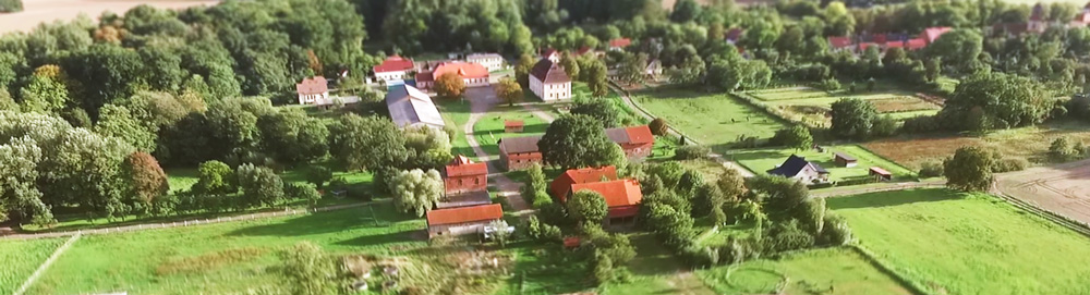 Dorf Zernikow (Hintergrund) und Guts Ensemble: Guthshaus (Mittelgrund) und Mal wieder Land sehen (Vordergrund)